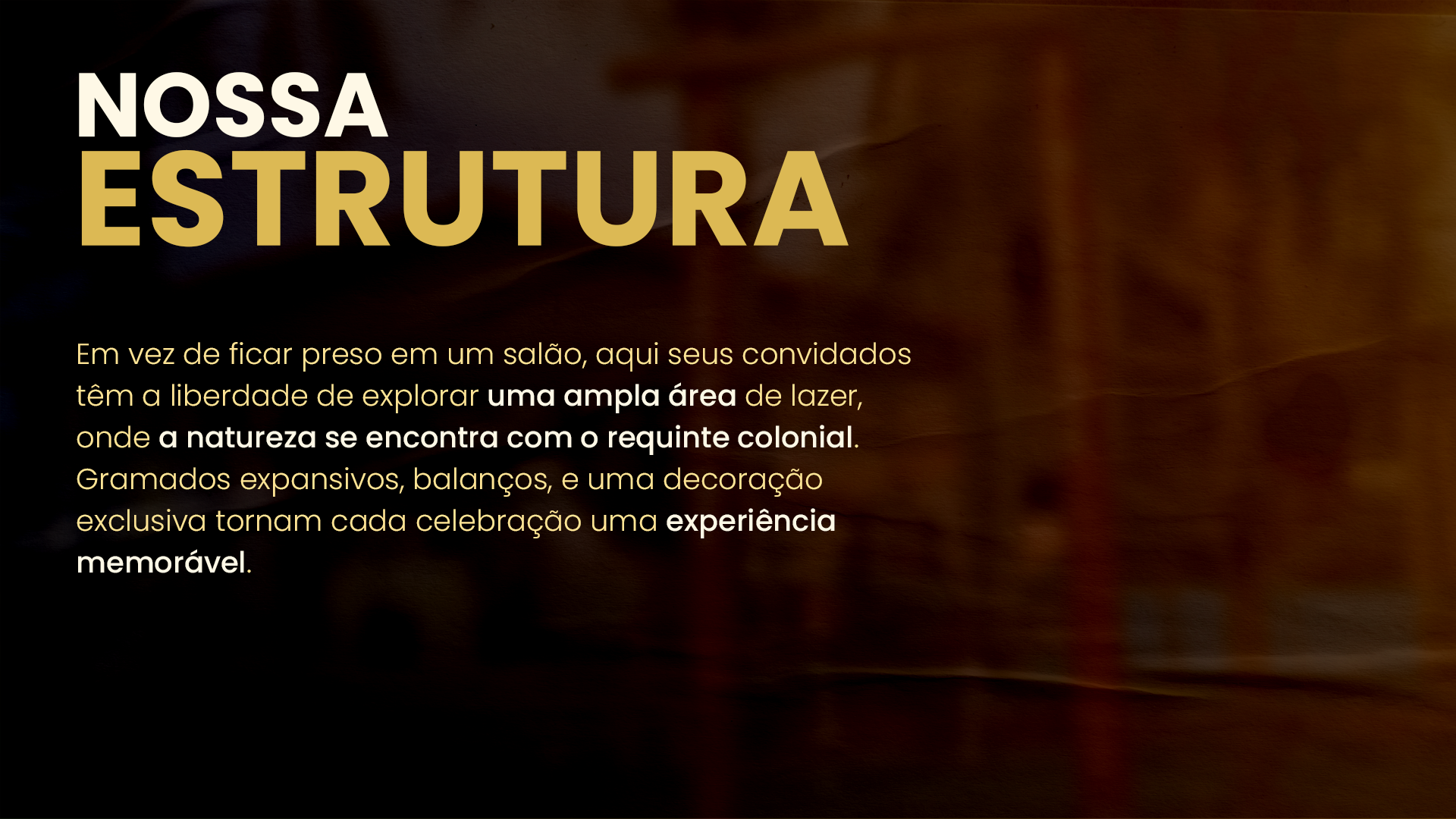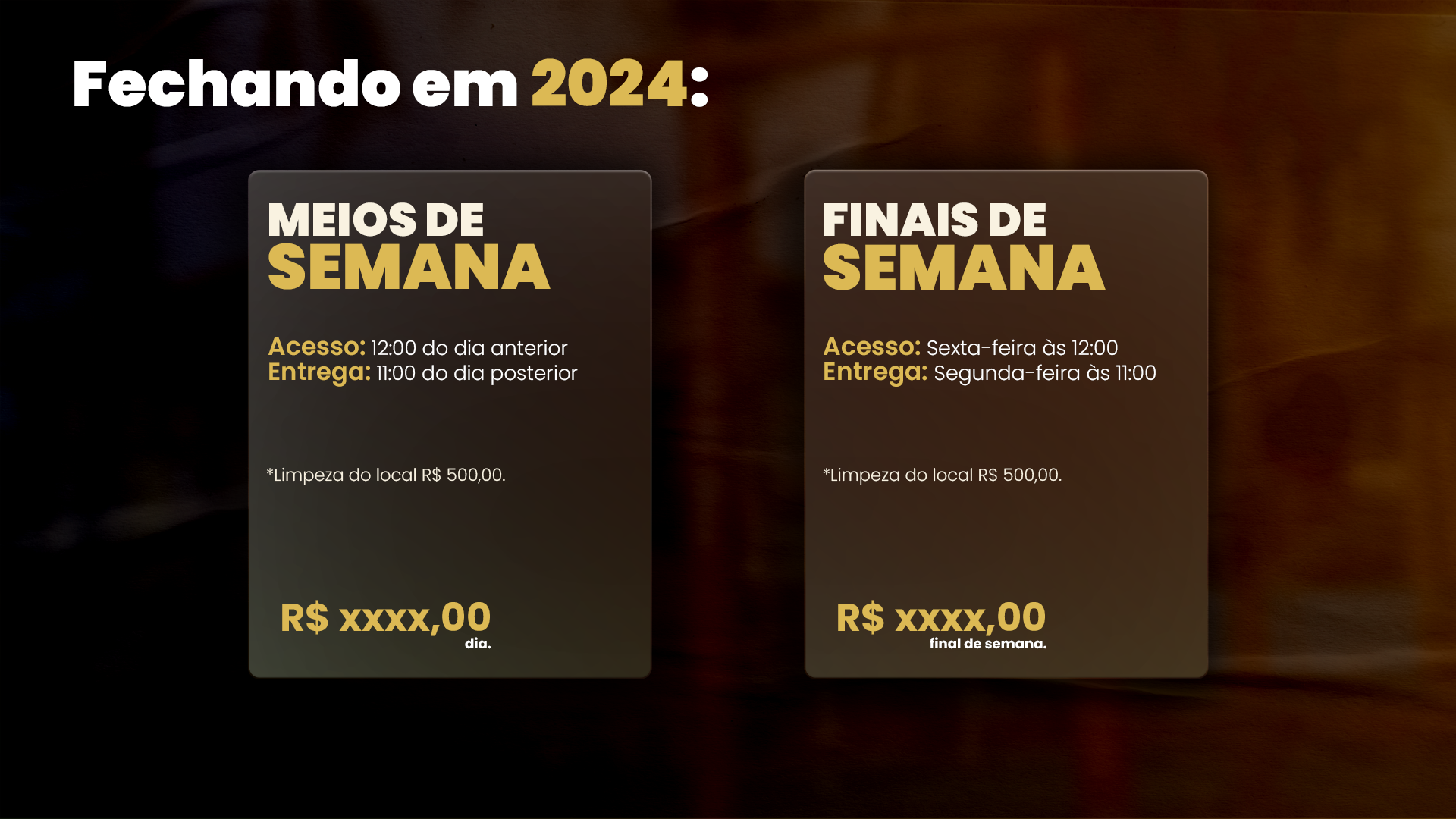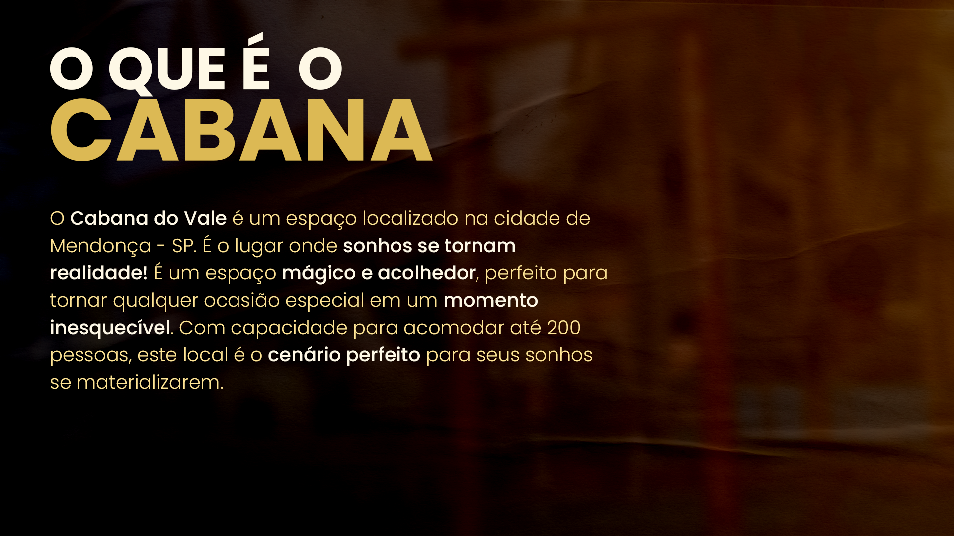 Este projeto foi desenvolvido com o objetivo de apresentar o espaço a potenciais interessados em alugá-lo. As cores foram selecionadas de maneira a proporcionar contraste entre si e também com o fundo. A escolha da textura de papel visa manter o estilo mais rústico do local.