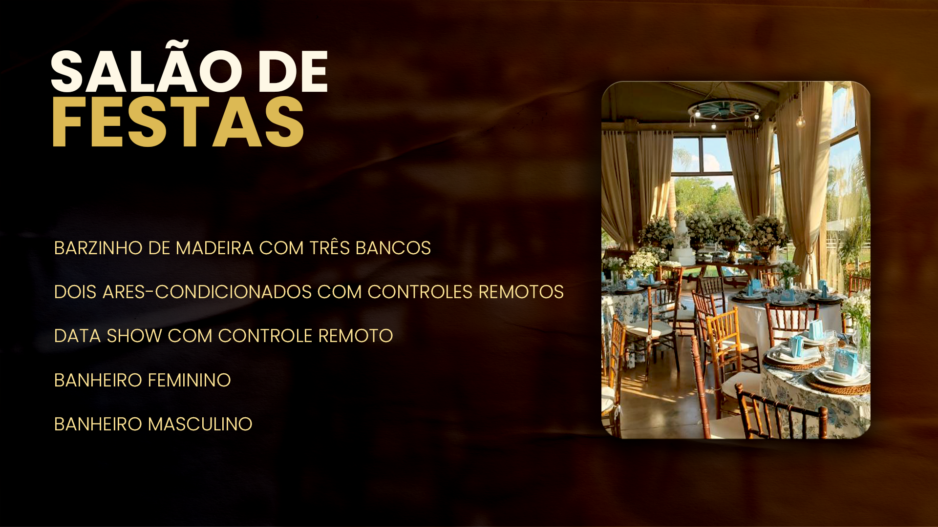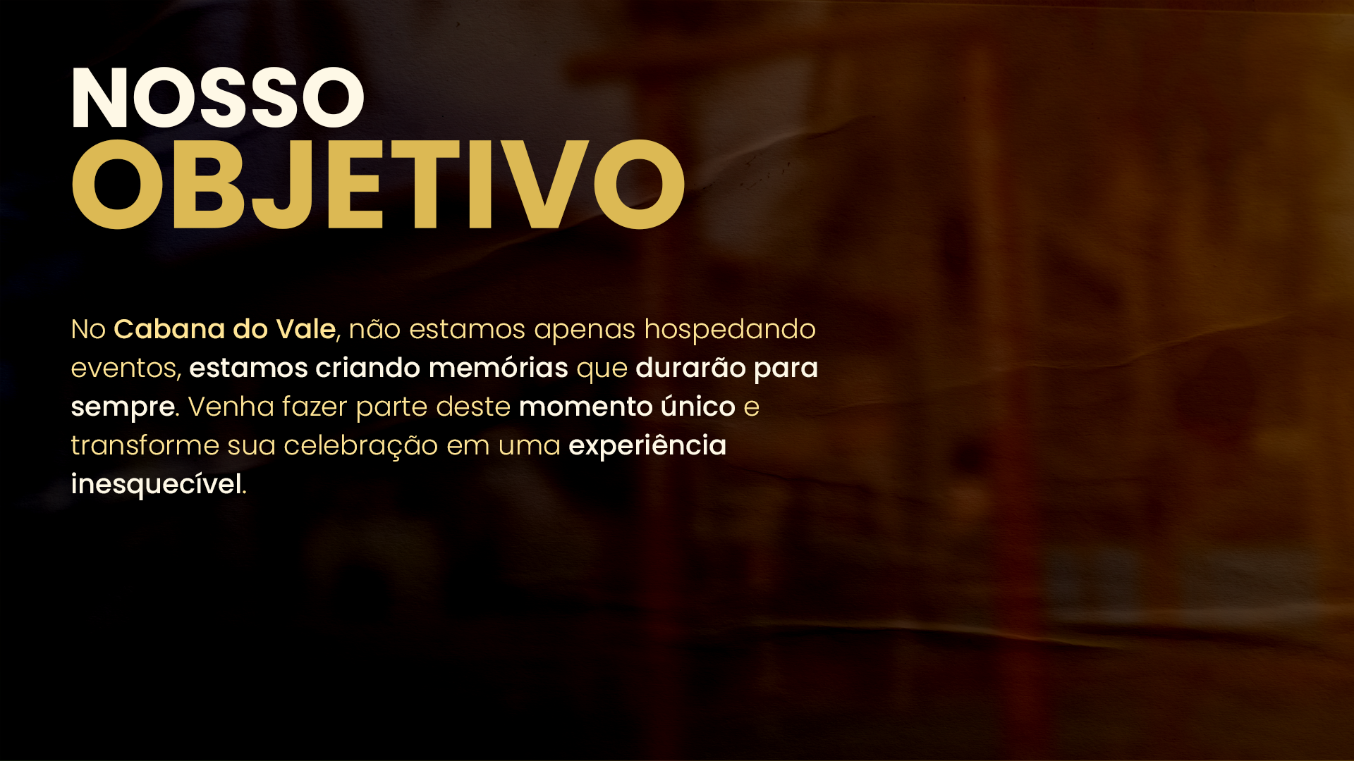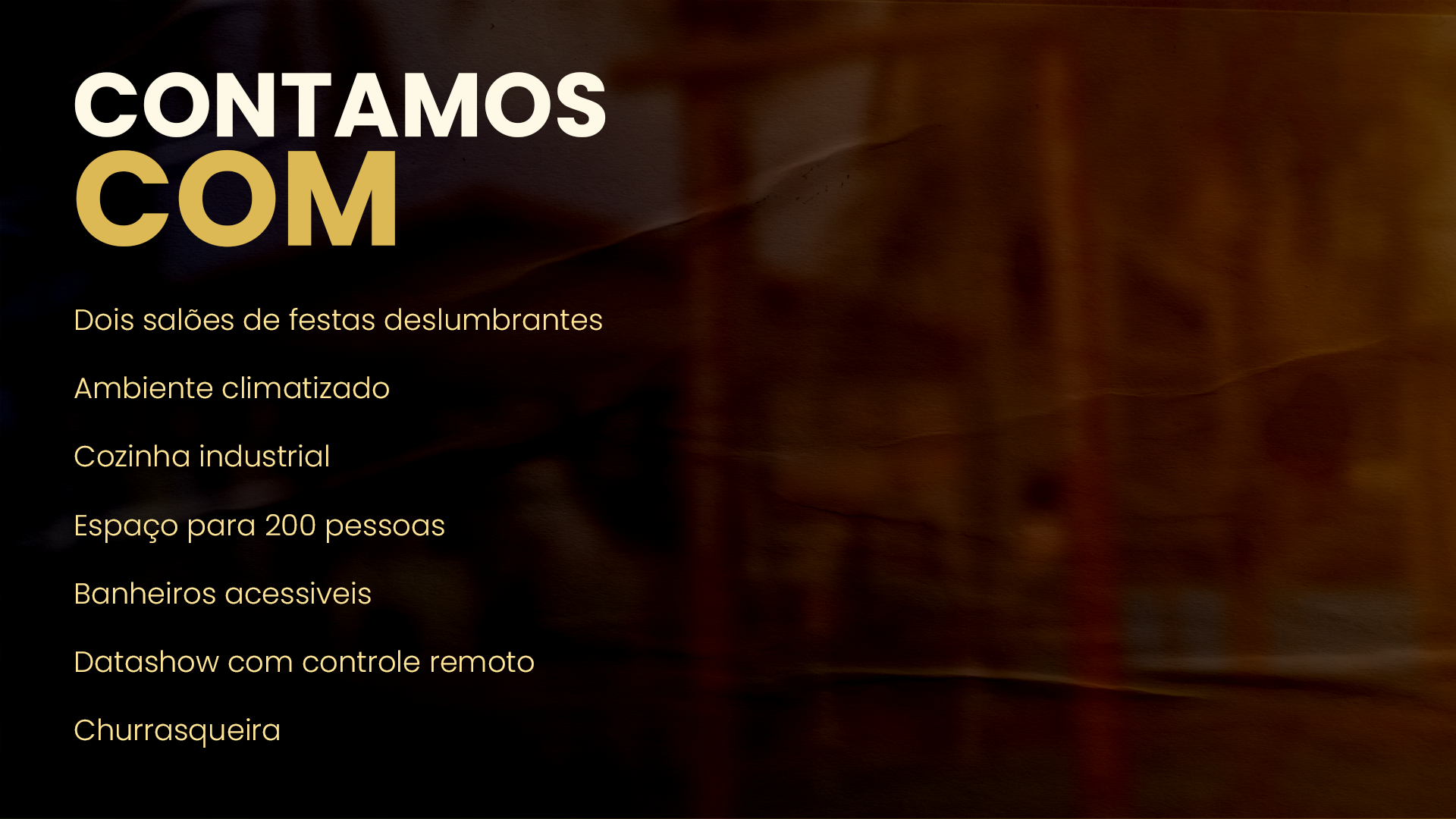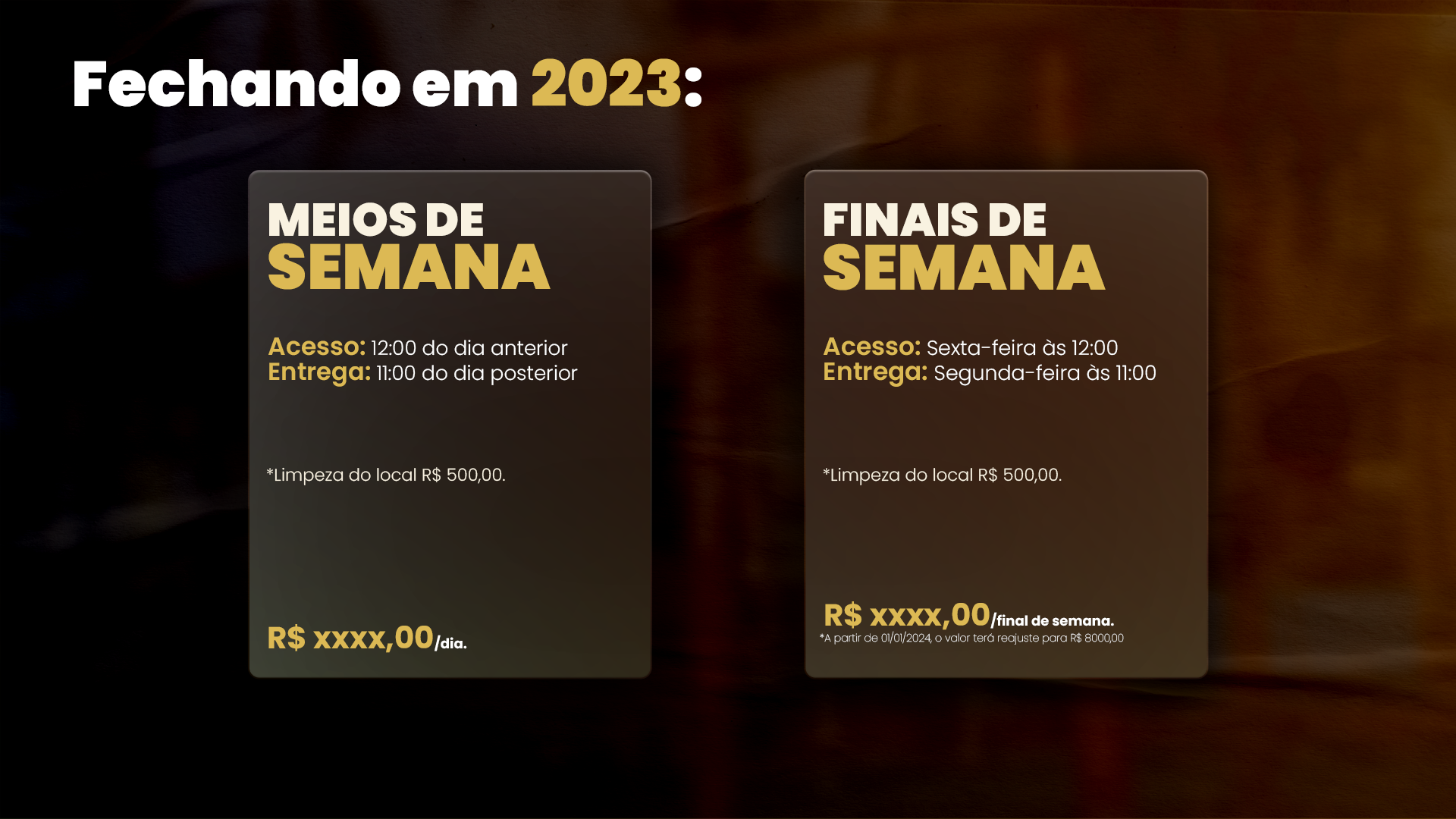 Este projeto foi desenvolvido com o objetivo de apresentar o espaço a potenciais interessados em alugá-lo. As cores foram selecionadas de maneira a proporcionar contraste entre si e também com o fundo. A escolha da textura de papel visa manter o estilo mais rústico do local.